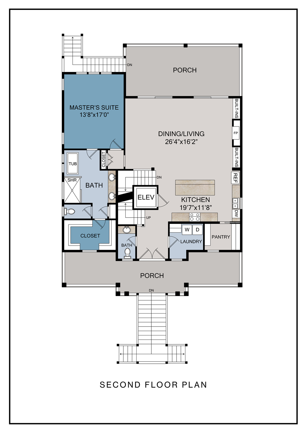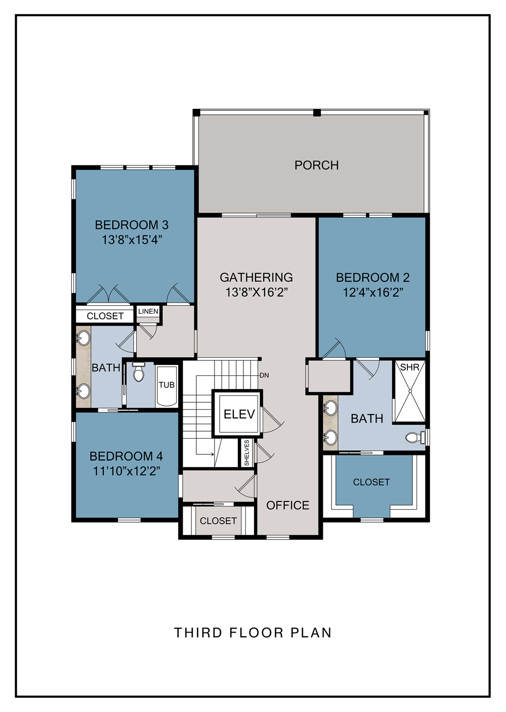 The East Bend is perfect for a large family. The rear oriented view and an open living area with main floors owners suite. The kitchen features a large island and a walk in pantry. The second floor has oversized secondary bedrooms, a gathering room with porch access and a bunk room. There is a an optional elevator and a full front porch adds to the outdoor living space.